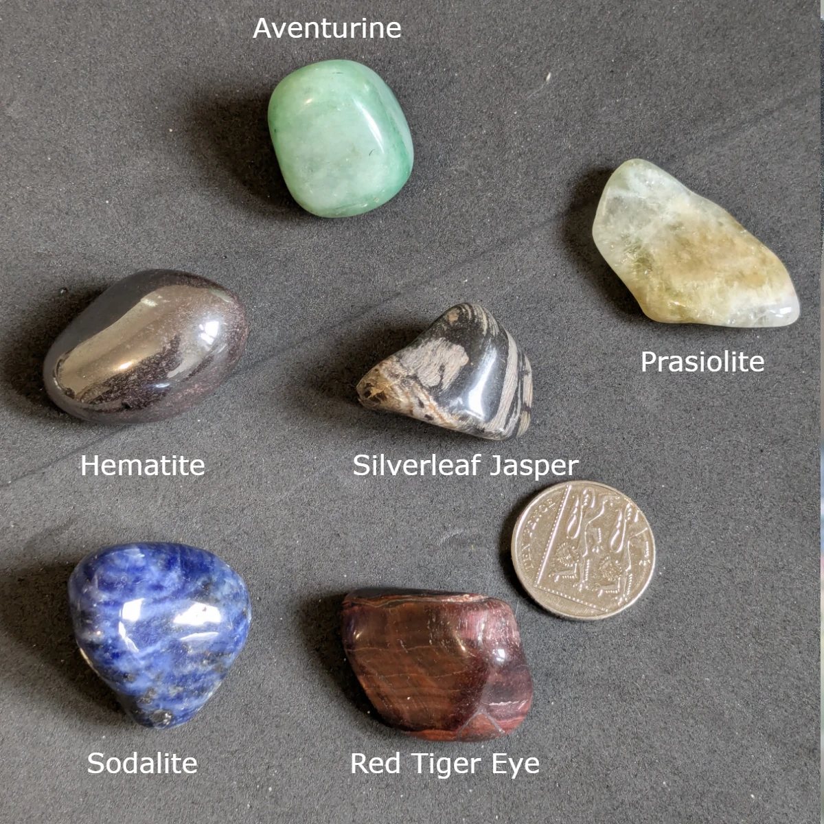 Floating Crystal Display Frame – 6 Natural Tumbled Gemstones (Aventurine, Red Tiger Eye, Sodalite, Silverleaf Jasper, Prasiolite, Hematite)